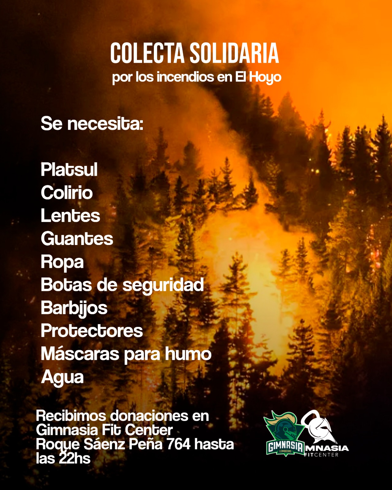 El Club Gimnasia y Esgrima de Comodoro Rivadavia invita a toda la comunidad a sumarse a una colecta solidaria destinada a las personas que están atravesando una difícil situación a raíz de los incendios en la región cordillerana de Chubut.